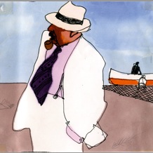 1978, studio per copertina Maigret, pennarelli su cartaQuando, agli inizi degli anni Settanta, negli uffici grafici editoriali e pubblicitari furono introdotti i pennarelli, Pintér volle sperimentarli, con felicissimi risultati. Lo stesso artista ricorda alcuni di questi lavori in cui la scelta tecnica è fondamentale per reinventare la copertina, come Maigret e il ladro, Maigret si sbaglia e Maigret e il libanese, ma anche Maigret e l’uomo solo e Maigret e il signor Charles, venduti in cofanetto con un curioso Ricettario della signora Maigret. Un’altra copertina disegnata con i pennarelli, Maigret e il vagabondo, ha una composizione insieme rigida e scherzosa, dove – secondo Pintér – il commissario, il clochard, il ponte, l’auto e il rimorchiatore sono «quasi elencati in ordine geometrico». Le copertine disegnate con questa tecnica sono tra le preferite dall’illustratore, scaturite da un intelligente gioco grafico e pittorico, fatte da Pintér quasi per scommessa e con sottile divertimento. In una delle più originali, Maigret e l’affare strip-tease, il commissario, di schiena, è evocato solo dalle sue bretelle scontornate su fondo bianco.